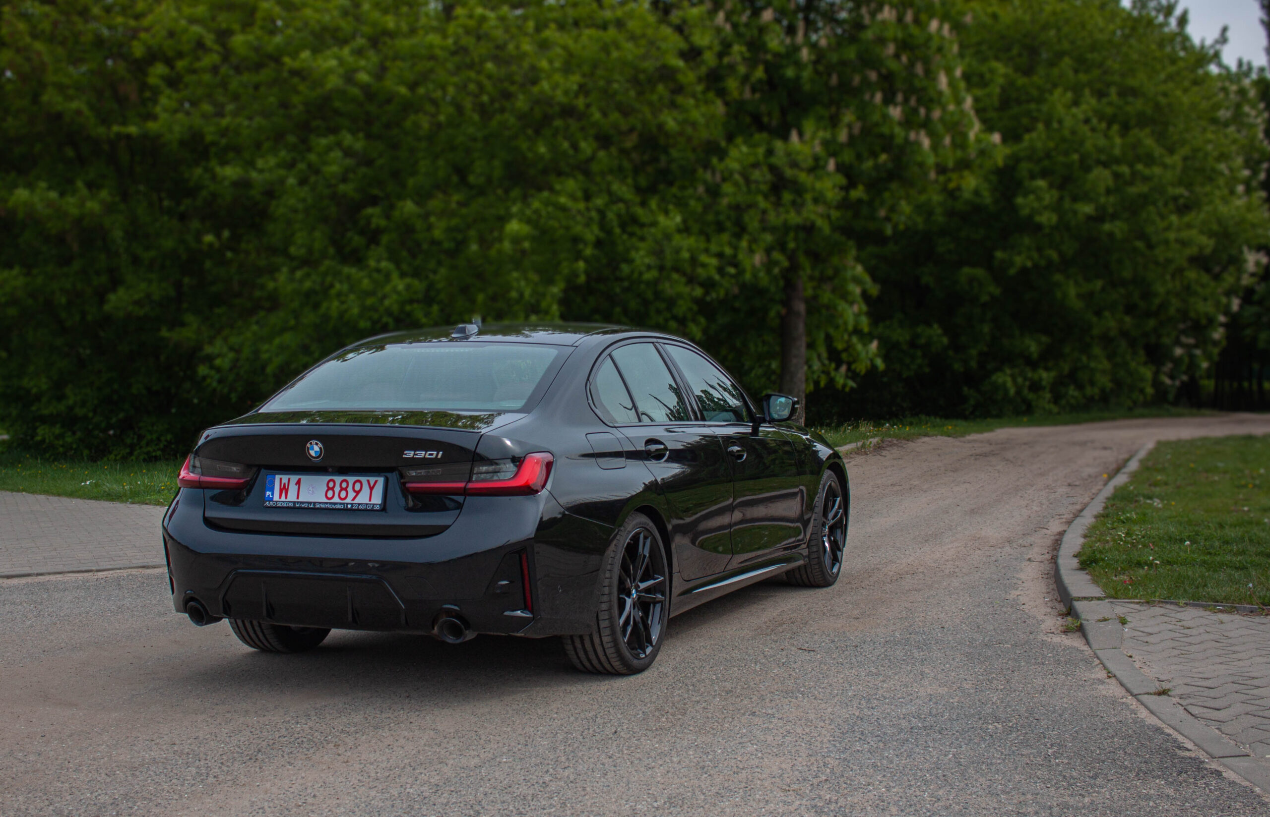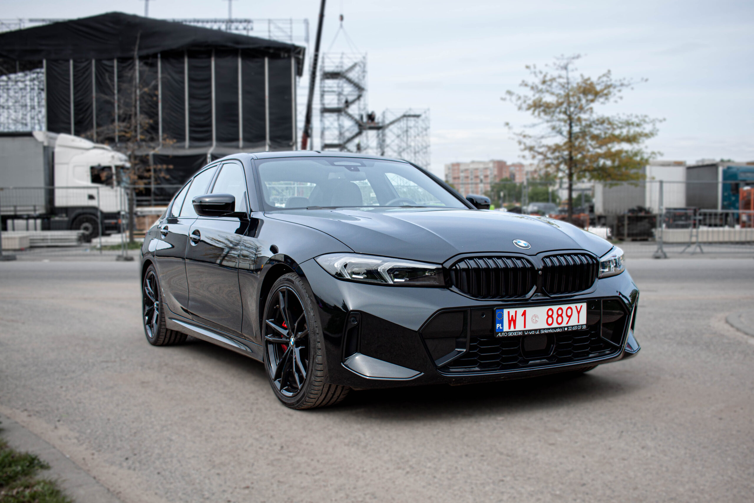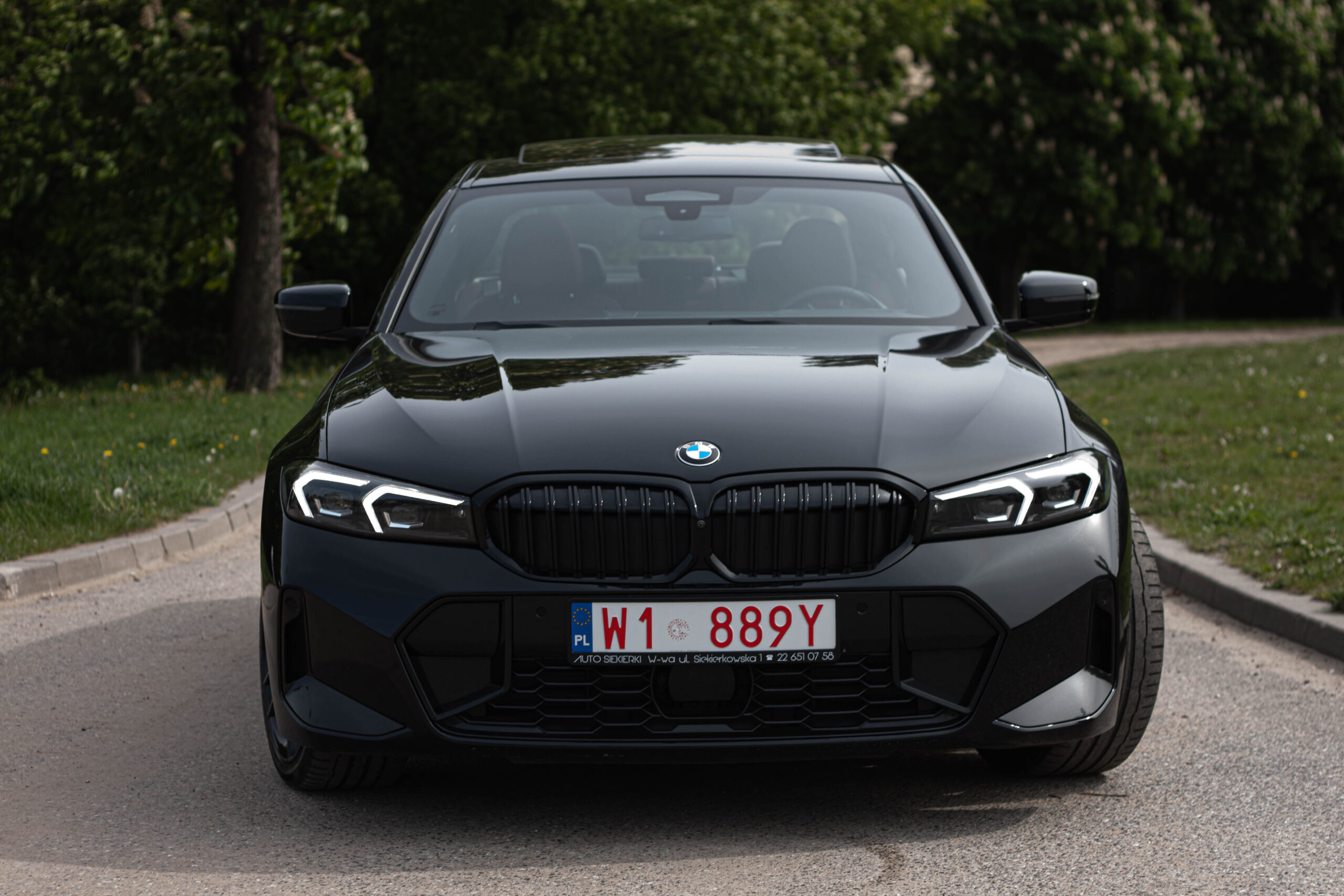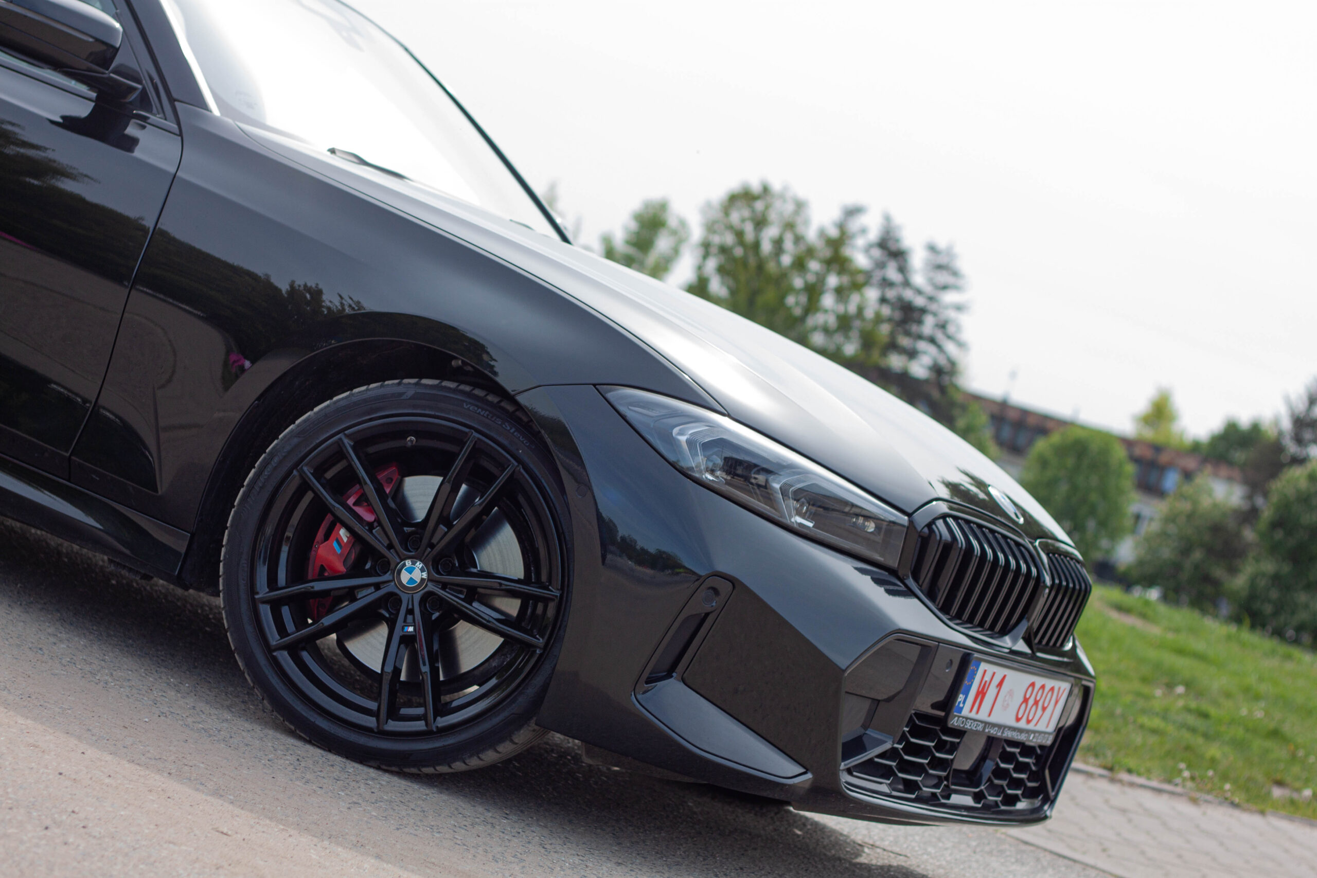 BMW Seria 3 G20 LCI z 2023 roku w unikalnej specyfikacji – lakier Black Sapphire w połączeniu z rzadką tapicerką Tacoma Red. Wersja M Sport Pro z pakietem aerodynamicznym, rozszerzonym Shadow Line, czerwonymi zaciskami hamulców i zawieszeniem M.