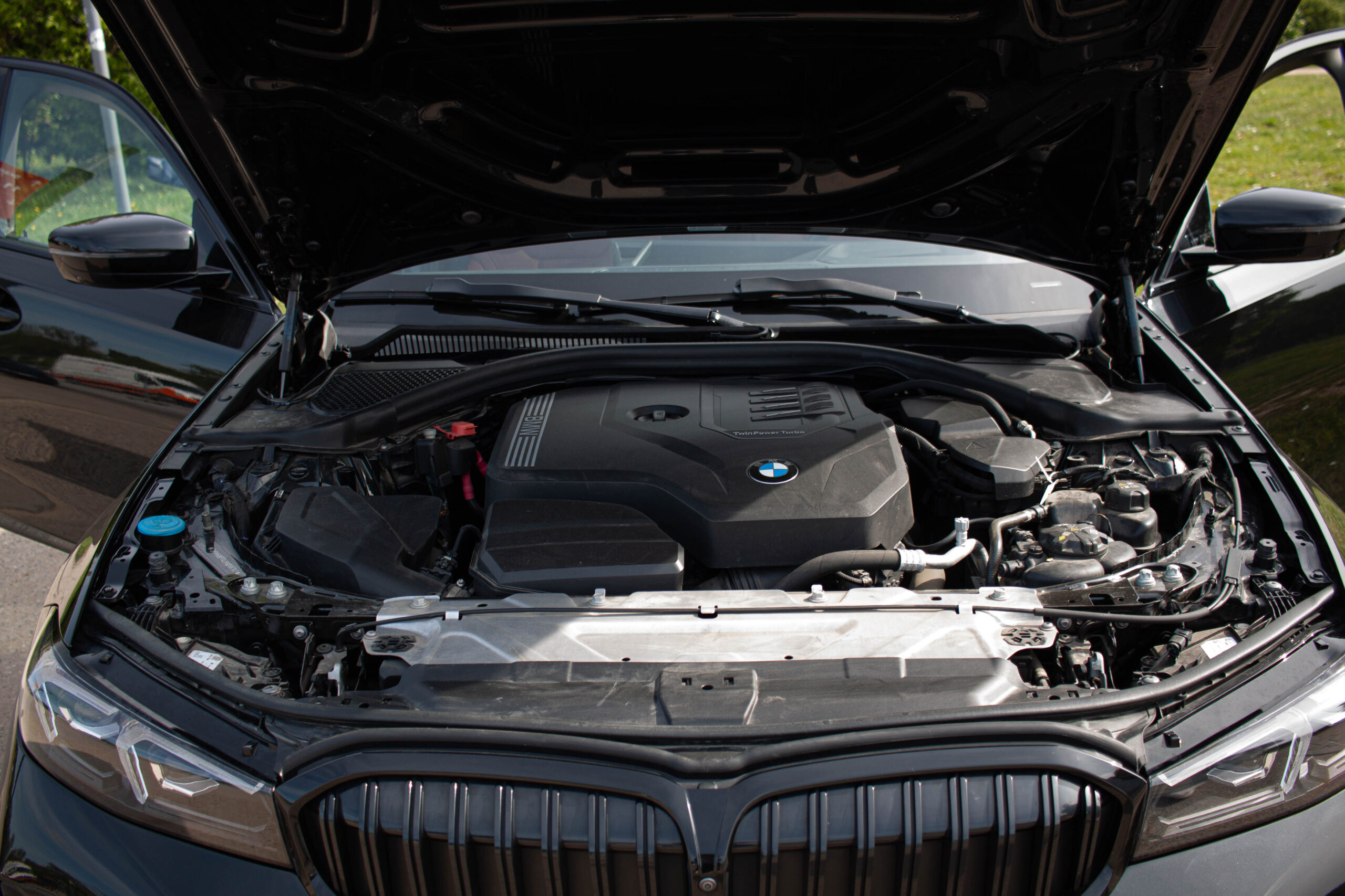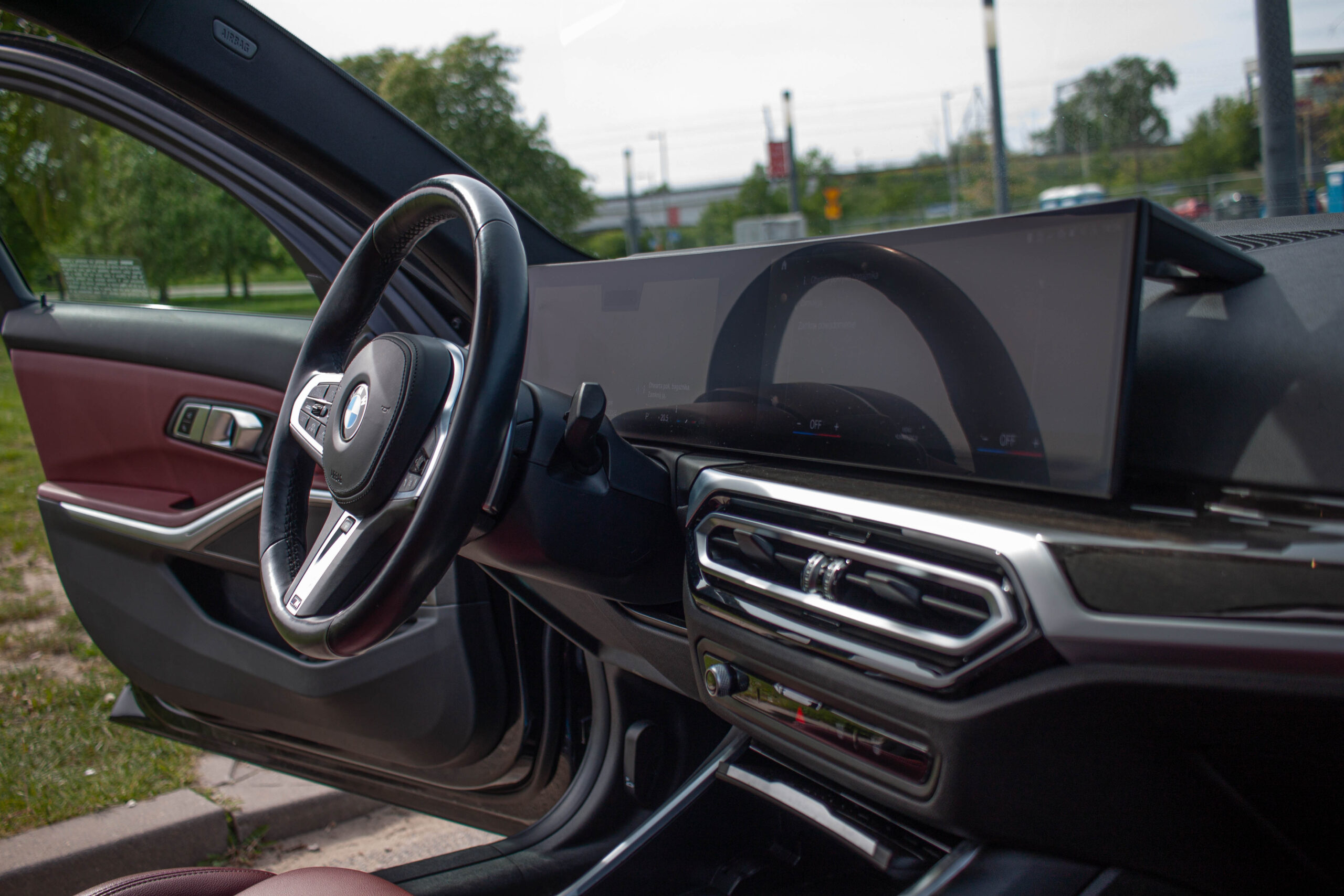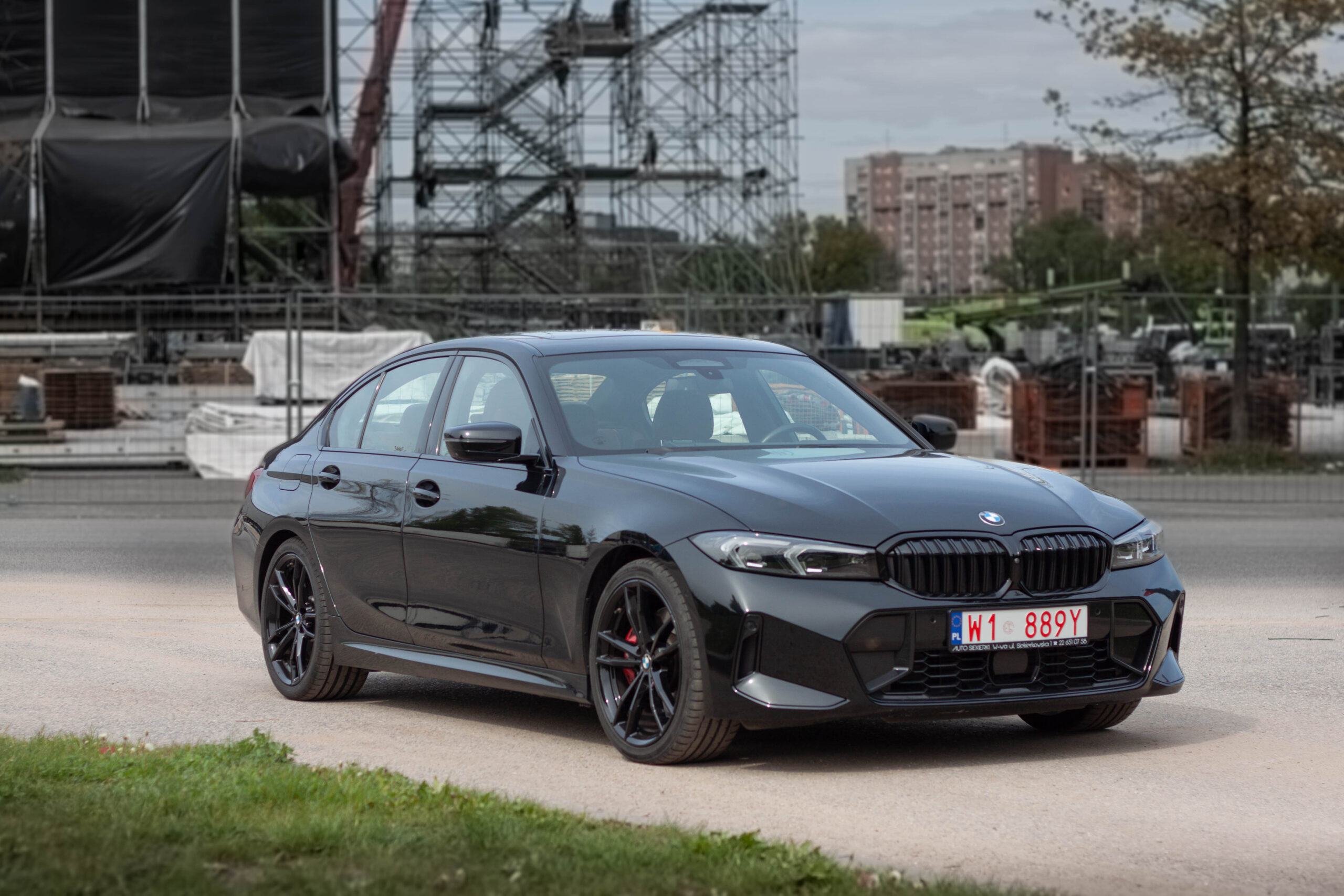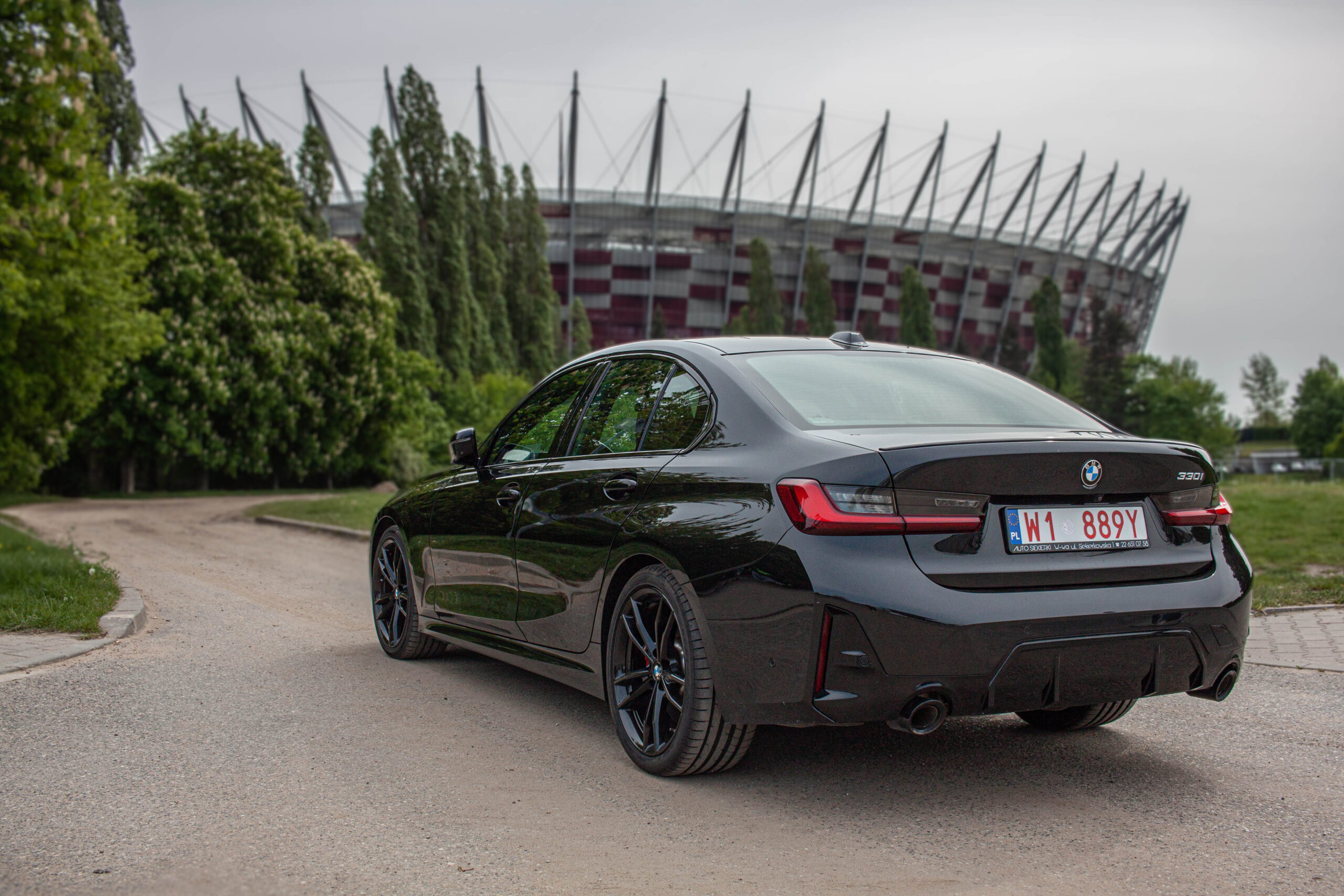 BMW Seria 3 G20 LCI z 2023 roku w unikalnej specyfikacji – lakier Black Sapphire w połączeniu z rzadką tapicerką Tacoma Red. Wersja M Sport Pro z pakietem aerodynamicznym, rozszerzonym Shadow Line, czerwonymi zaciskami hamulców i zawieszeniem M.